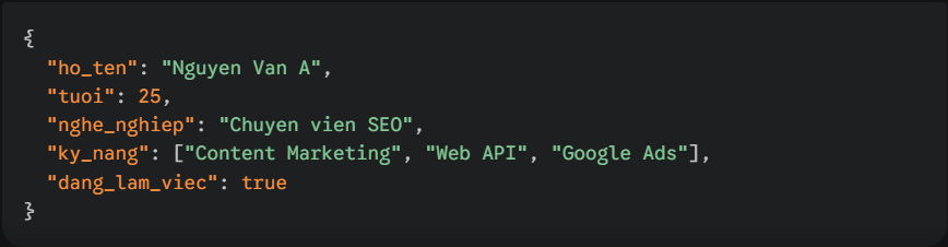 Nhìn vào đoạn mã trên, dù không phải lập trình viên, bạn cũng dễ dàng đoán được nó nói về một người tên Nguyễn Văn A, 25 tuổi, làm SEO, đúng không? Đó chính là sức mạnh của JSON!