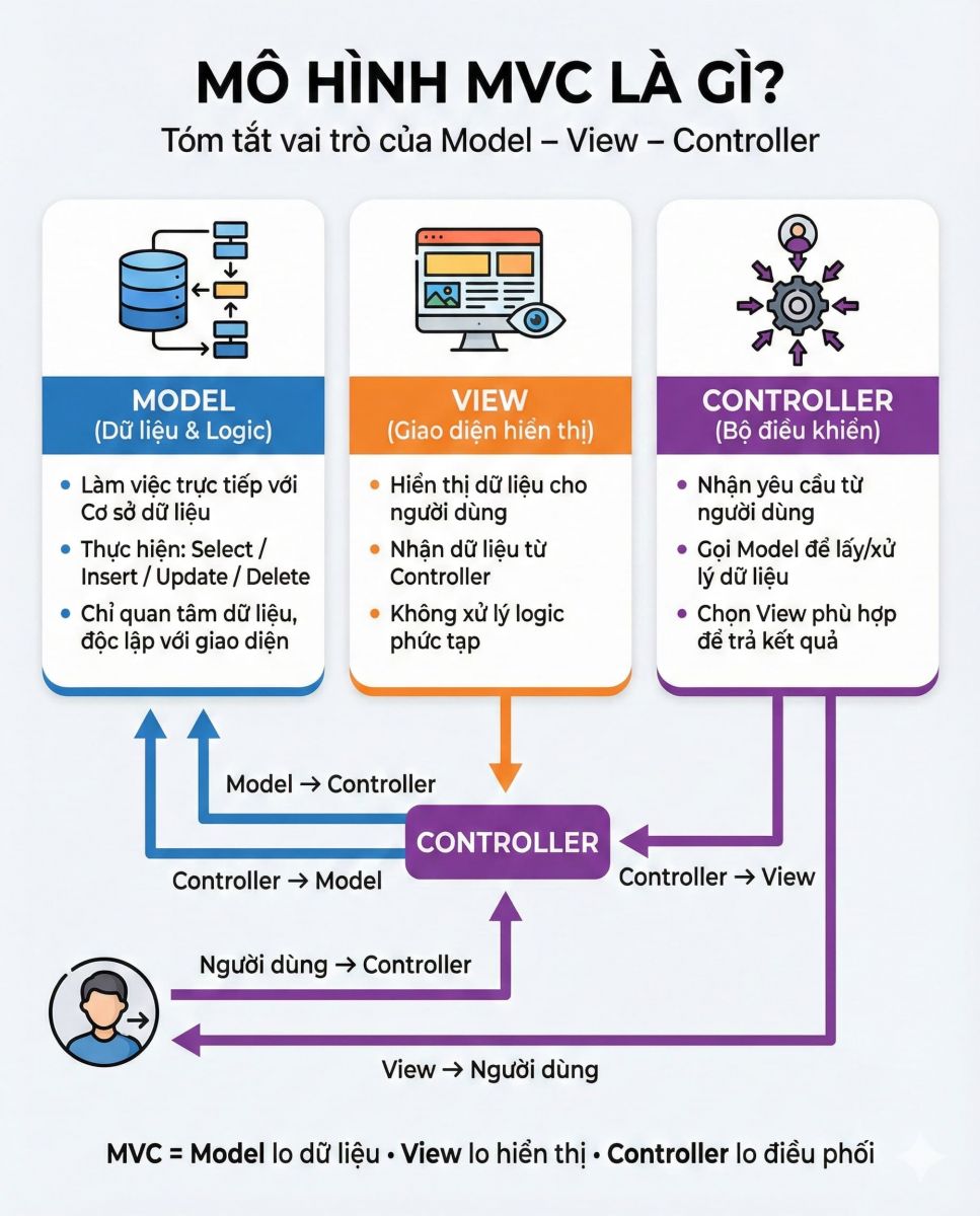 Ví dụ: Khi bạn nhấn nút "Tìm kiếm", Controller sẽ nhận từ khóa, bảo Model "Hãy tìm các sản phẩm có tên này", sau đó lấy danh sách kết quả và đẩy ra trang View "Kết quả tìm kiếm".