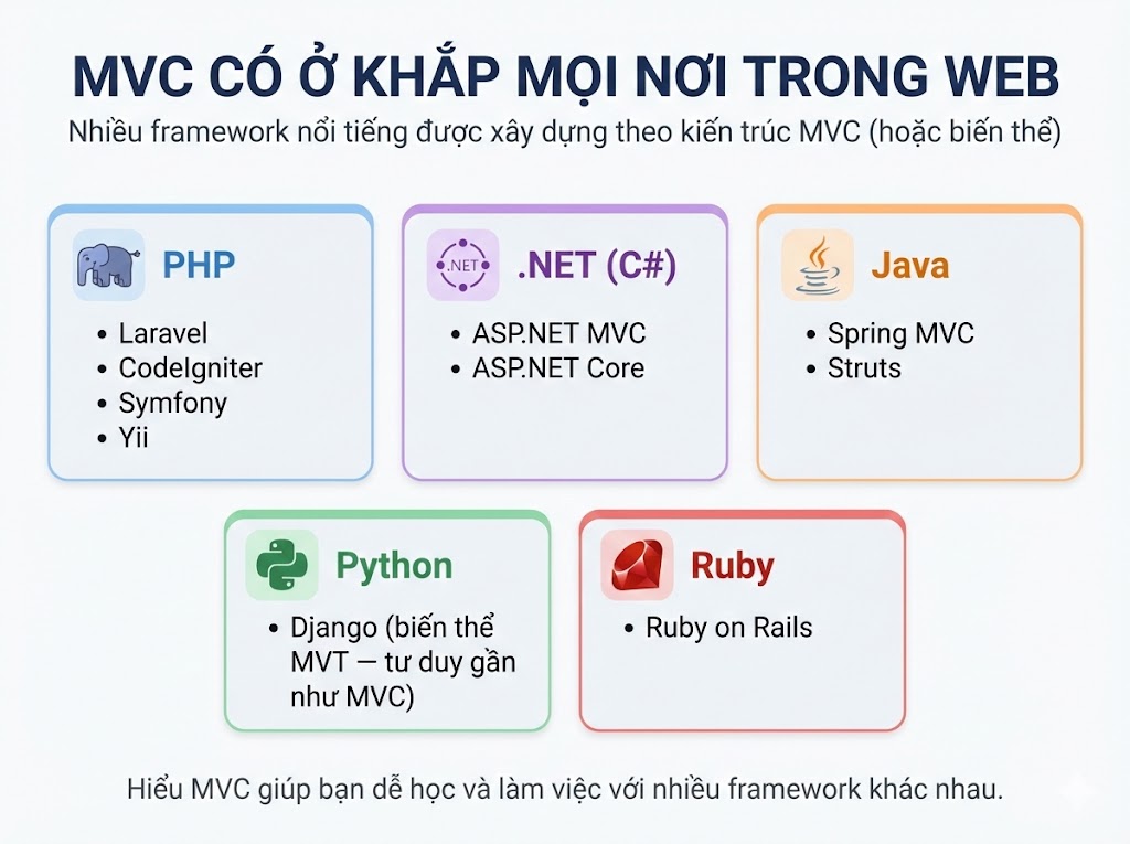 Nếu bạn đang học lập trình web, bạn sẽ thấy MVC trong lập trình web hiện diện ở khắp mọi nơi. Hầu hết các Framework nổi tiếng nhất hiện nay đều được xây dựng dựa trên kiến trúc này: